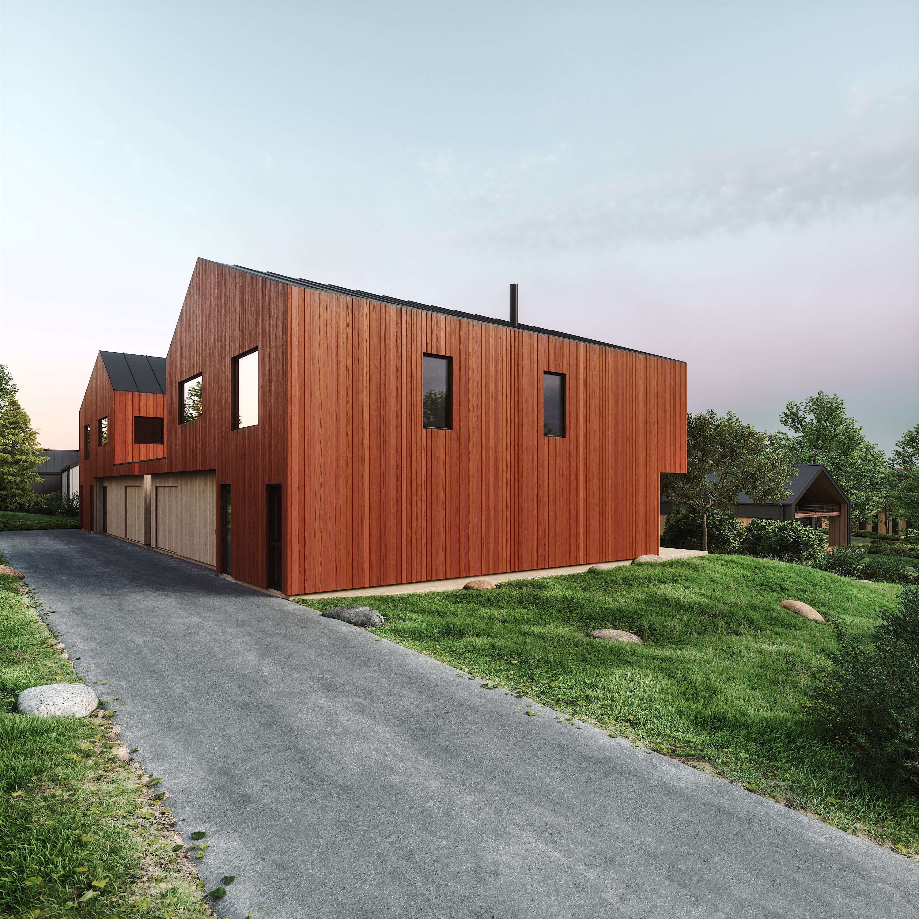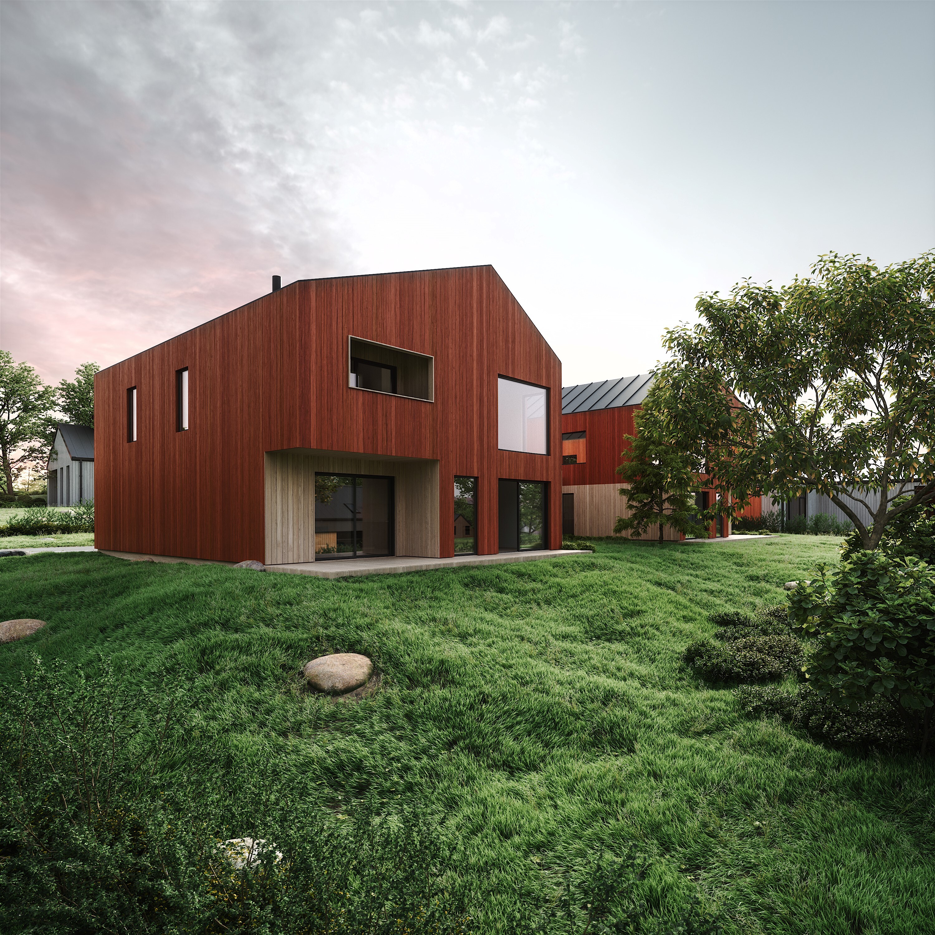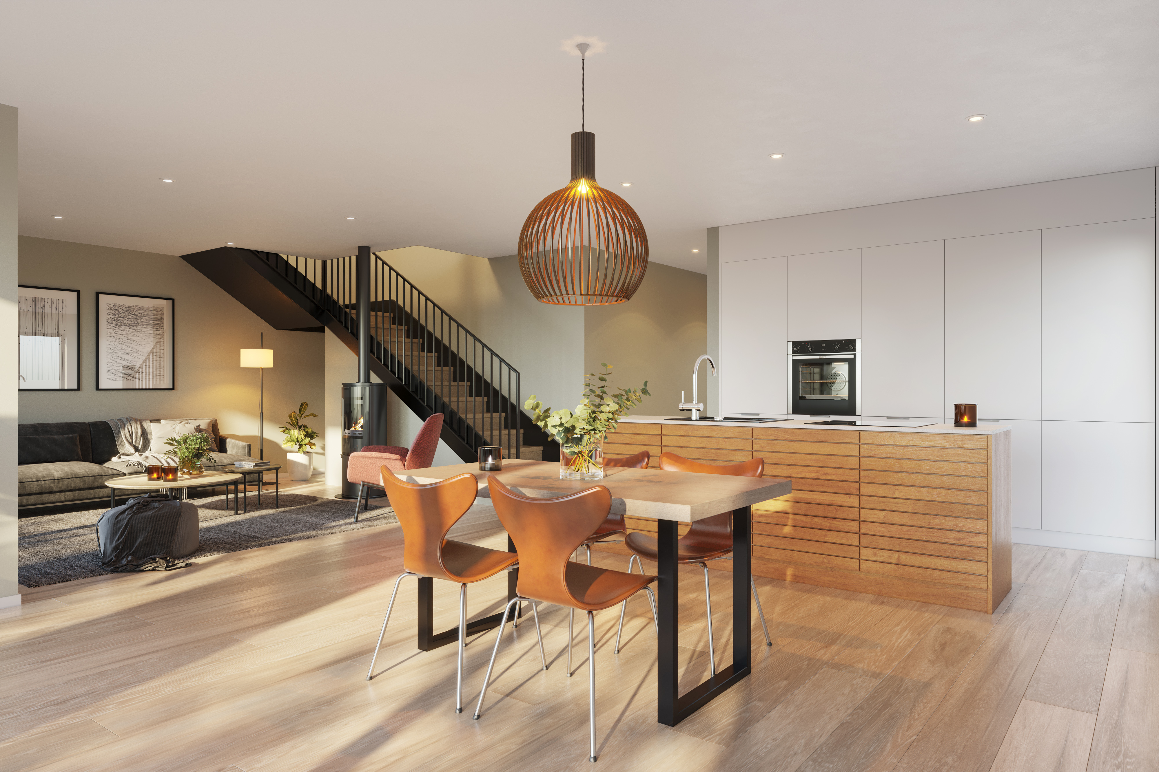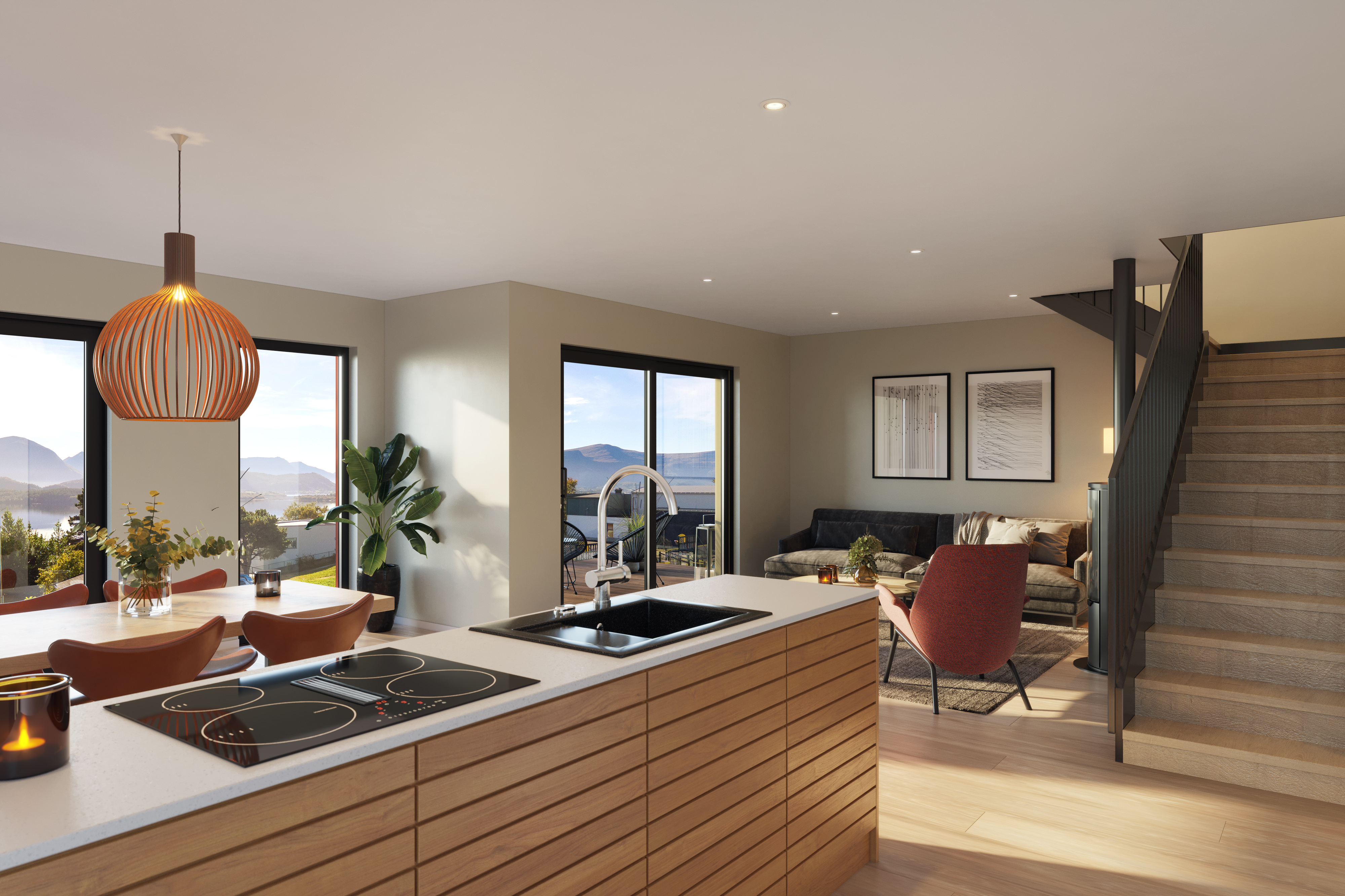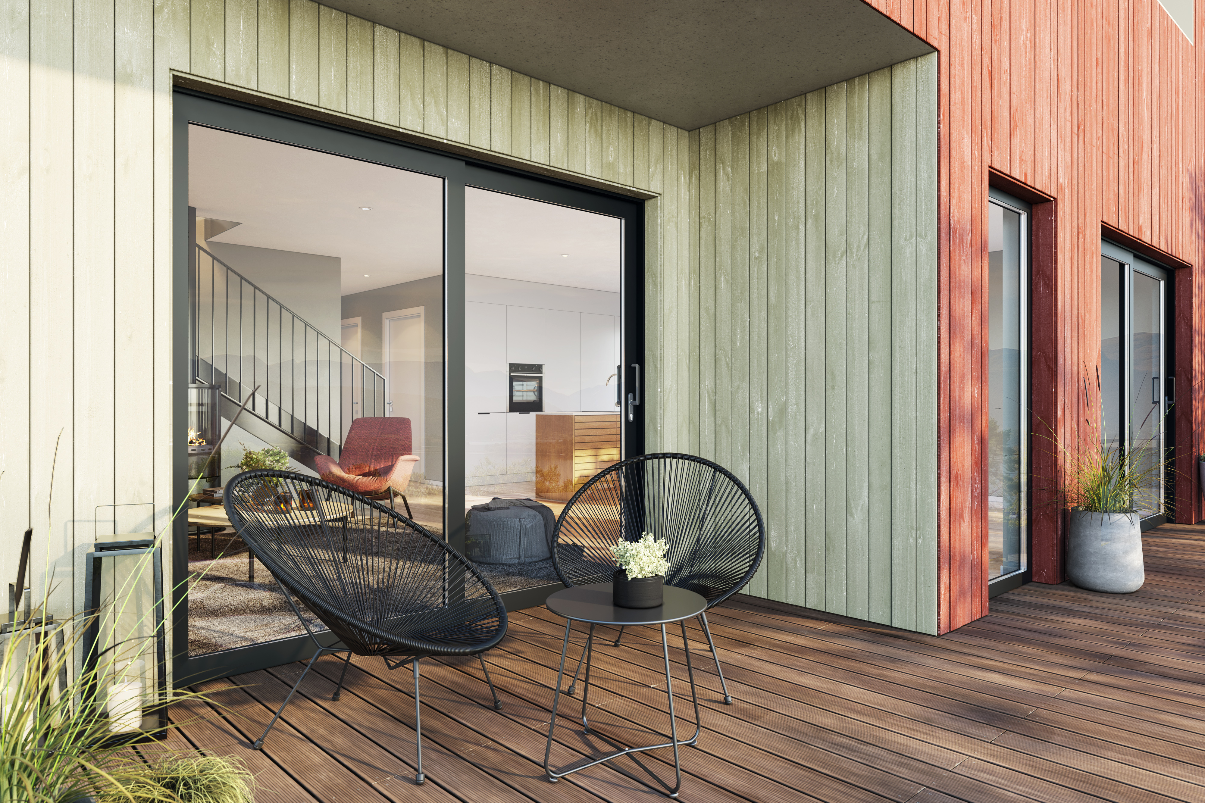 Arkitekt Manuela Hardy har tegnet de flotte boligene i Gartnerivegen 18F. Husene er skreddersydd for tomten og har stue og kjøkken i første etasje, med store vinduer i front. Dette gir deilig dagslys inn, og grensen mellom ute og inne viskes ut gjennom store skyvedører og vindusflater.