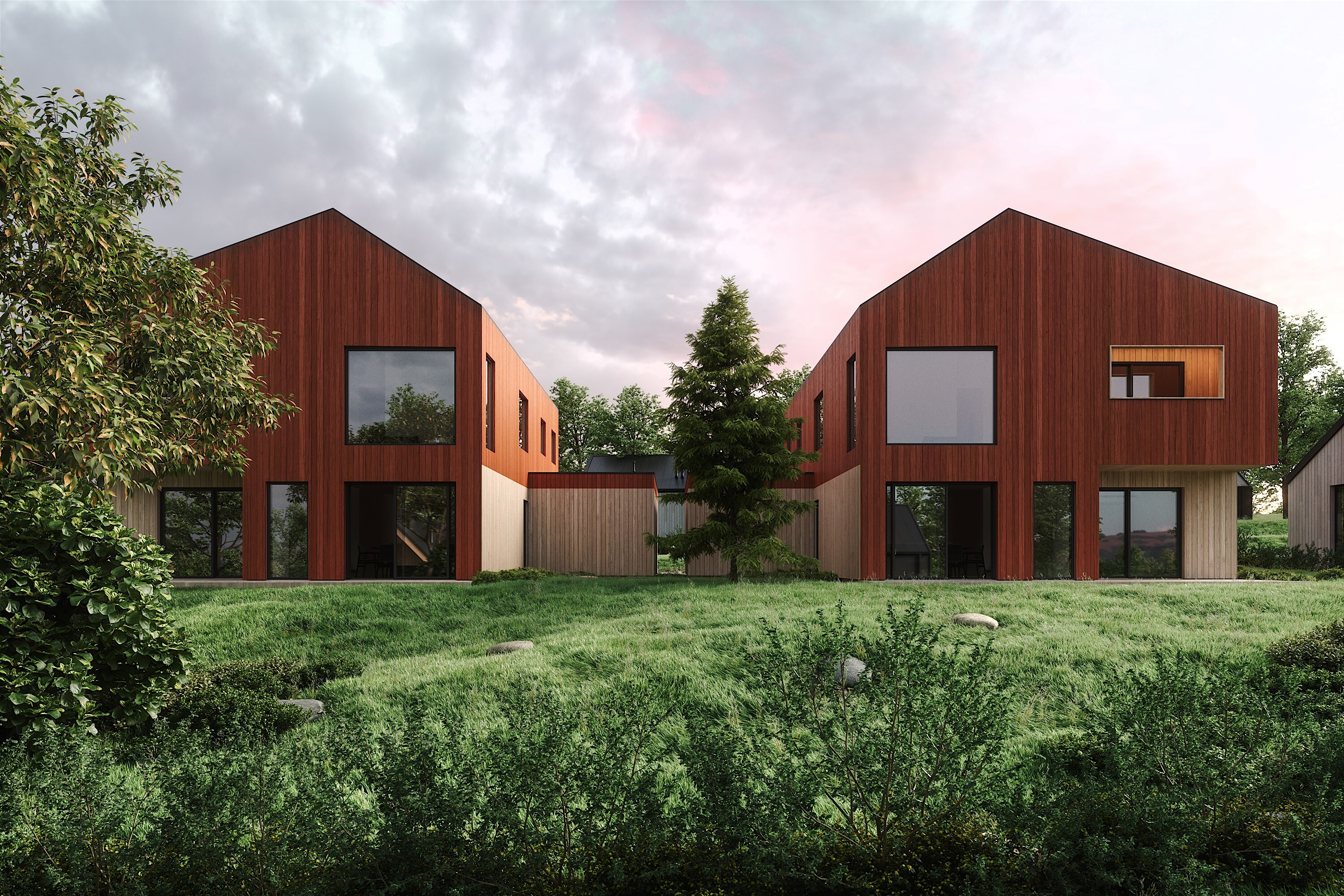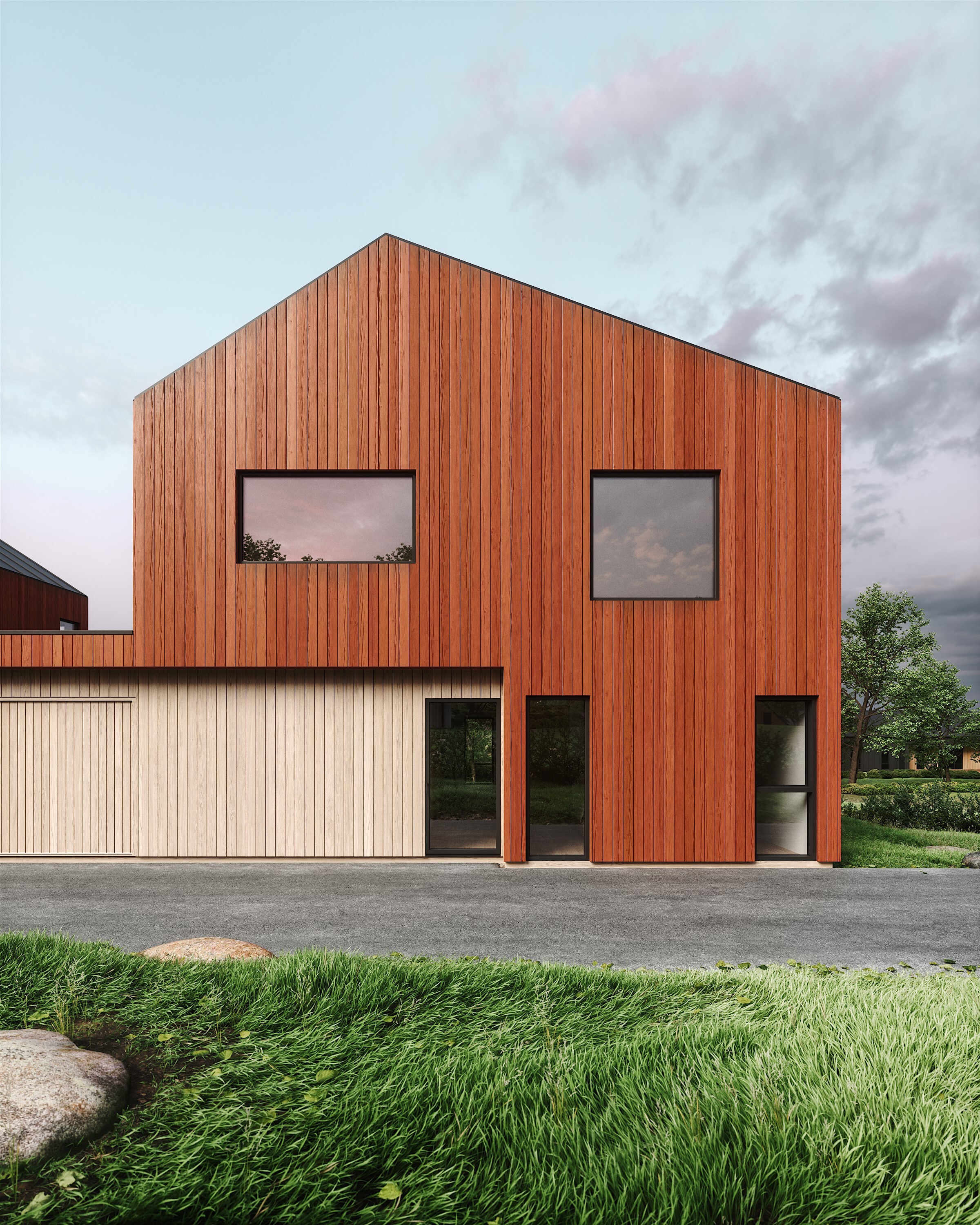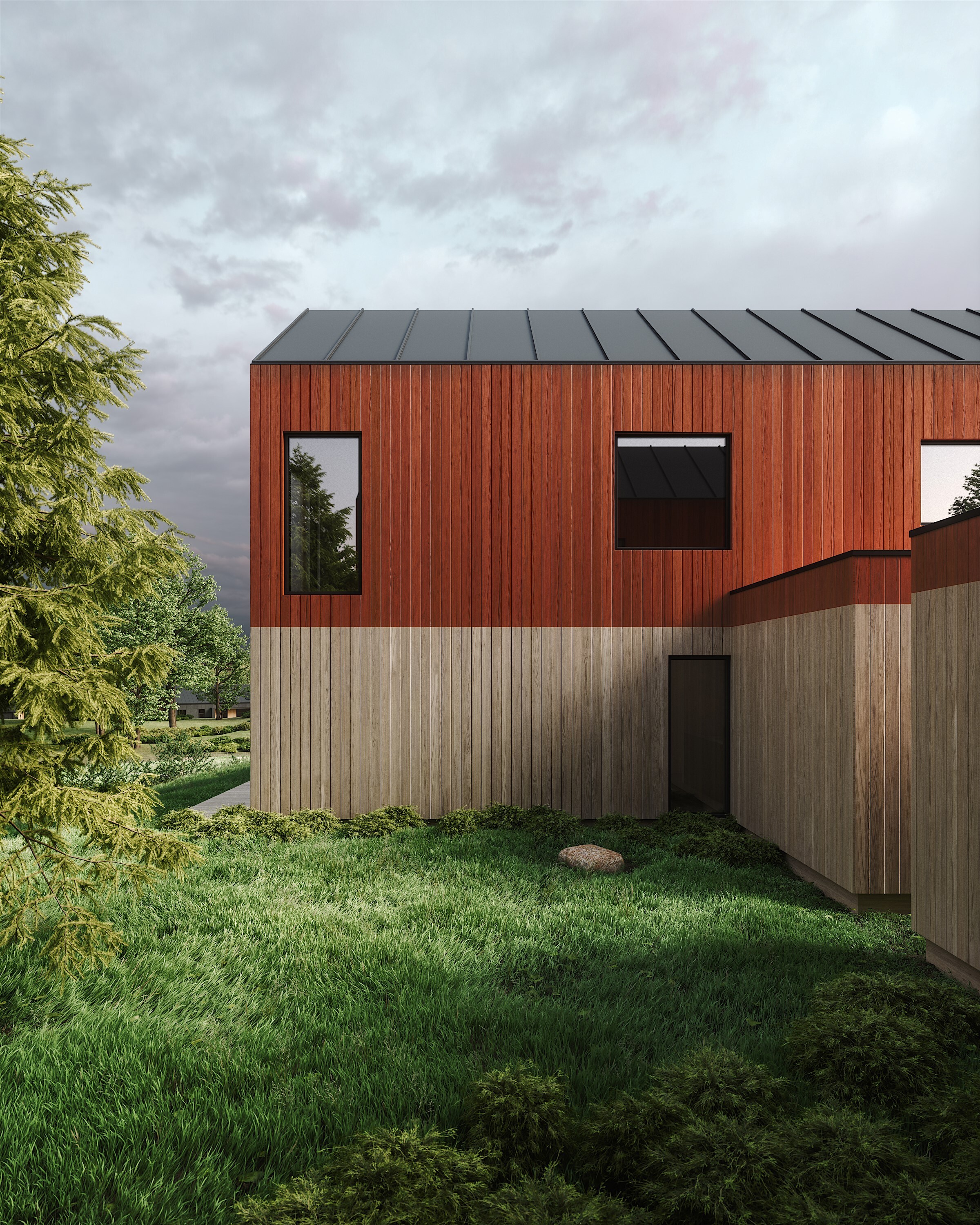 Utvendig kledning som dobbeltfalset rett kledning. Denne leveres med mellomstrøk i rød farge (lik illustrasjoner).