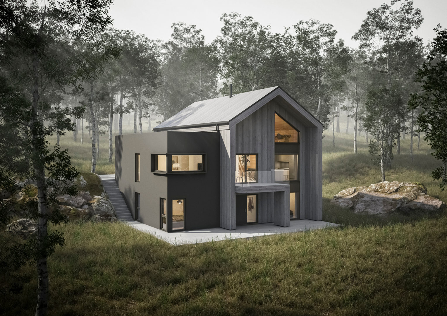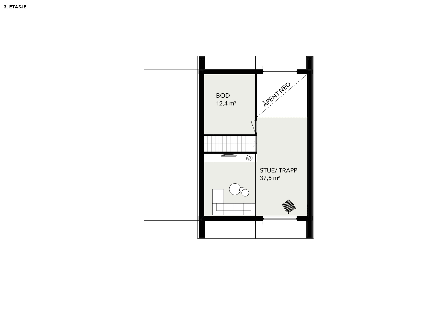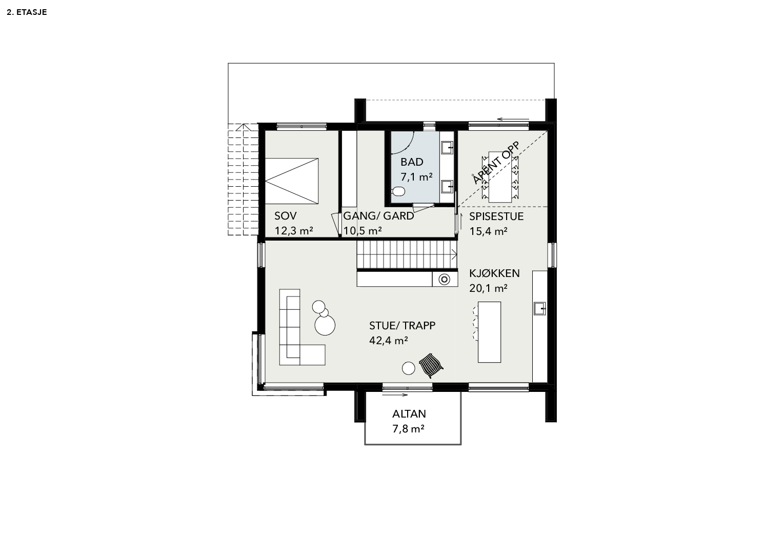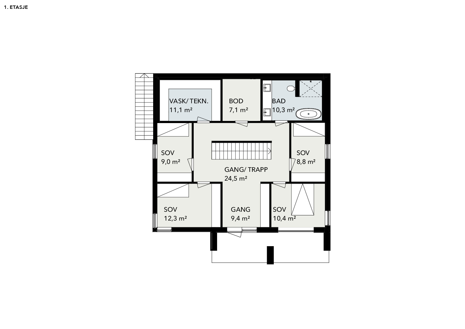 Her møtes moderne og klassisk arkitektur. Huset har et helt eget uttrykk og inneholder en privat sone med hovedsoverom, bad og garderobe. Fra spisestuen kan du se helt opp til mønet og loftstuen.