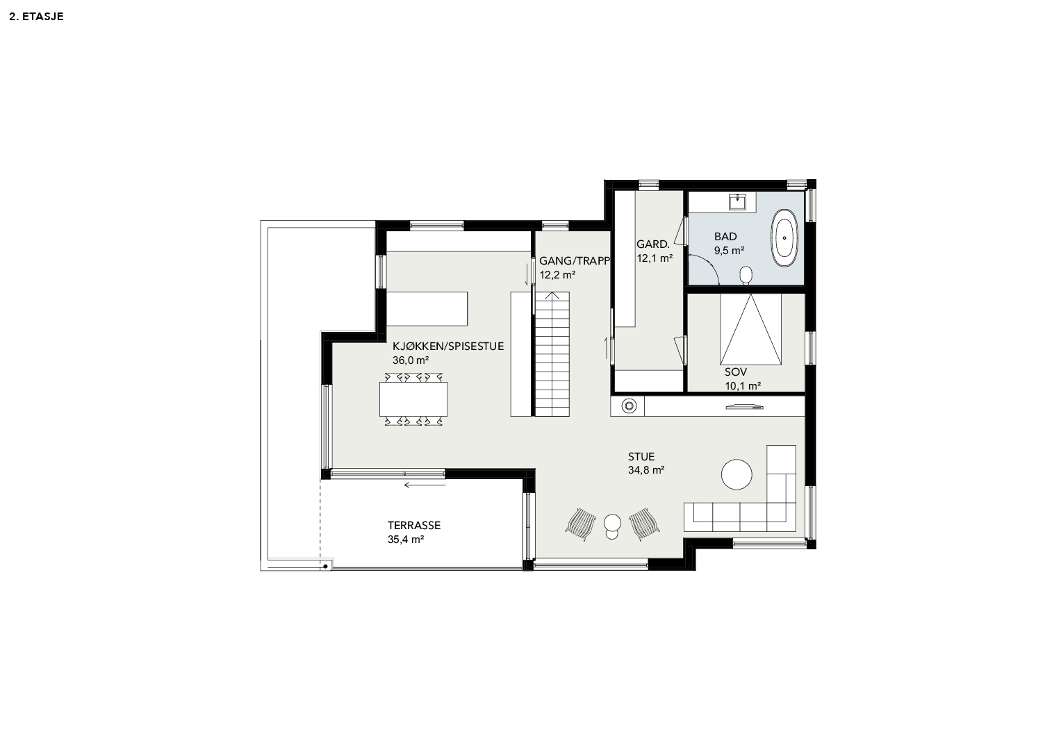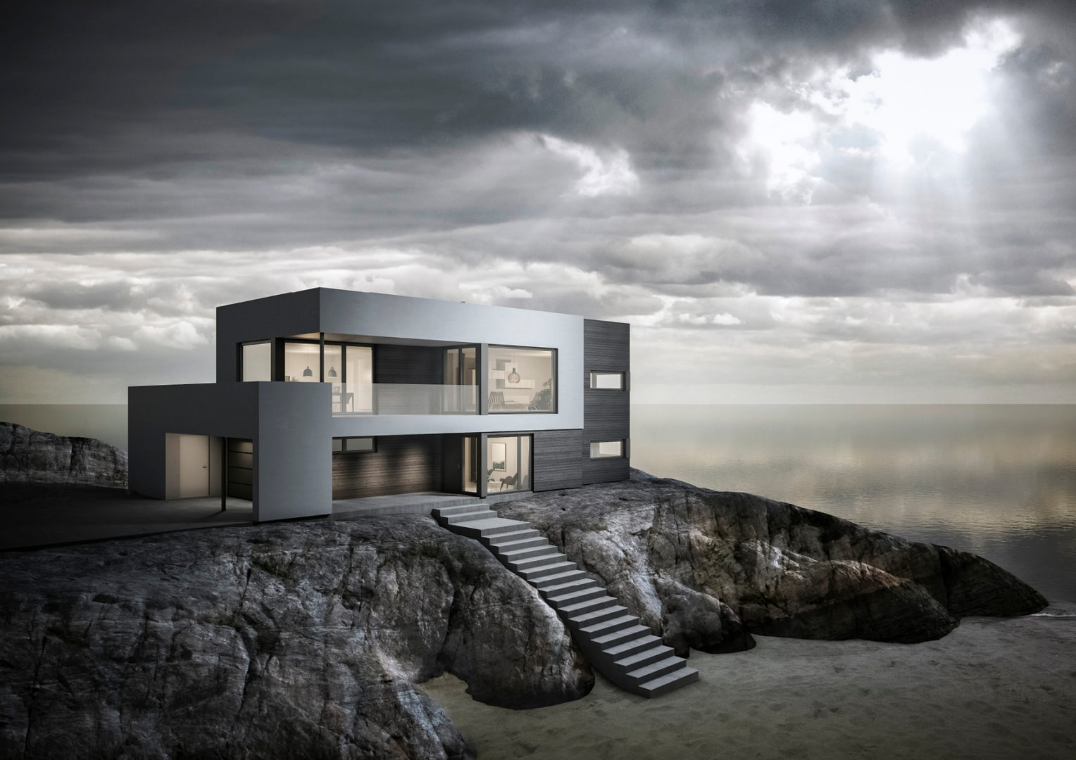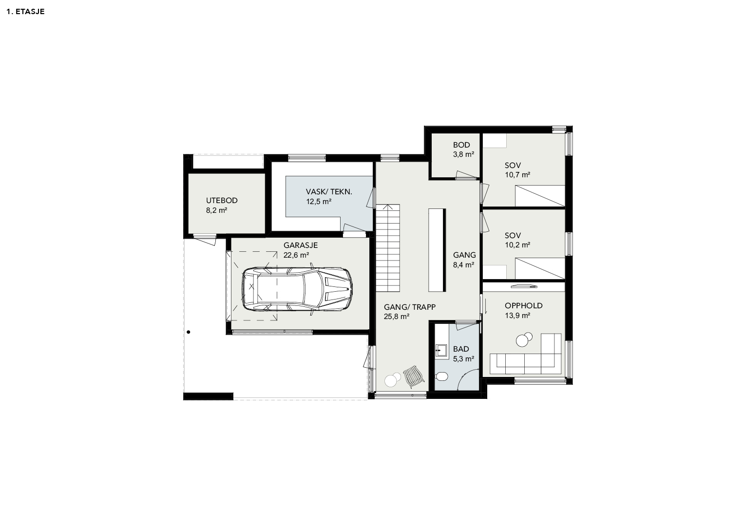 Ønsk gjestene velkommen i en lys og åpen entré. Det moderne huset har store vindusflater og inneholder integrert garasje.