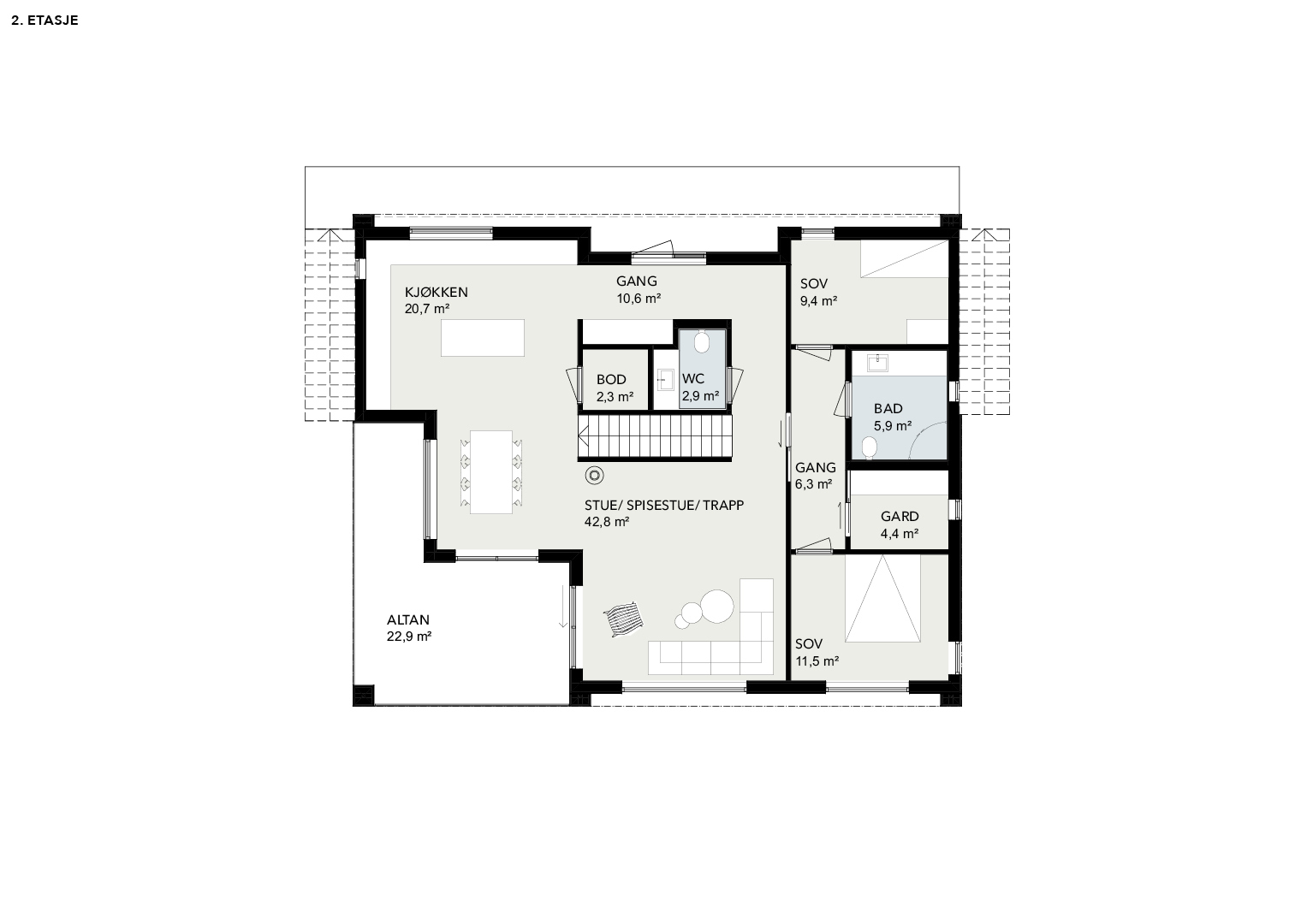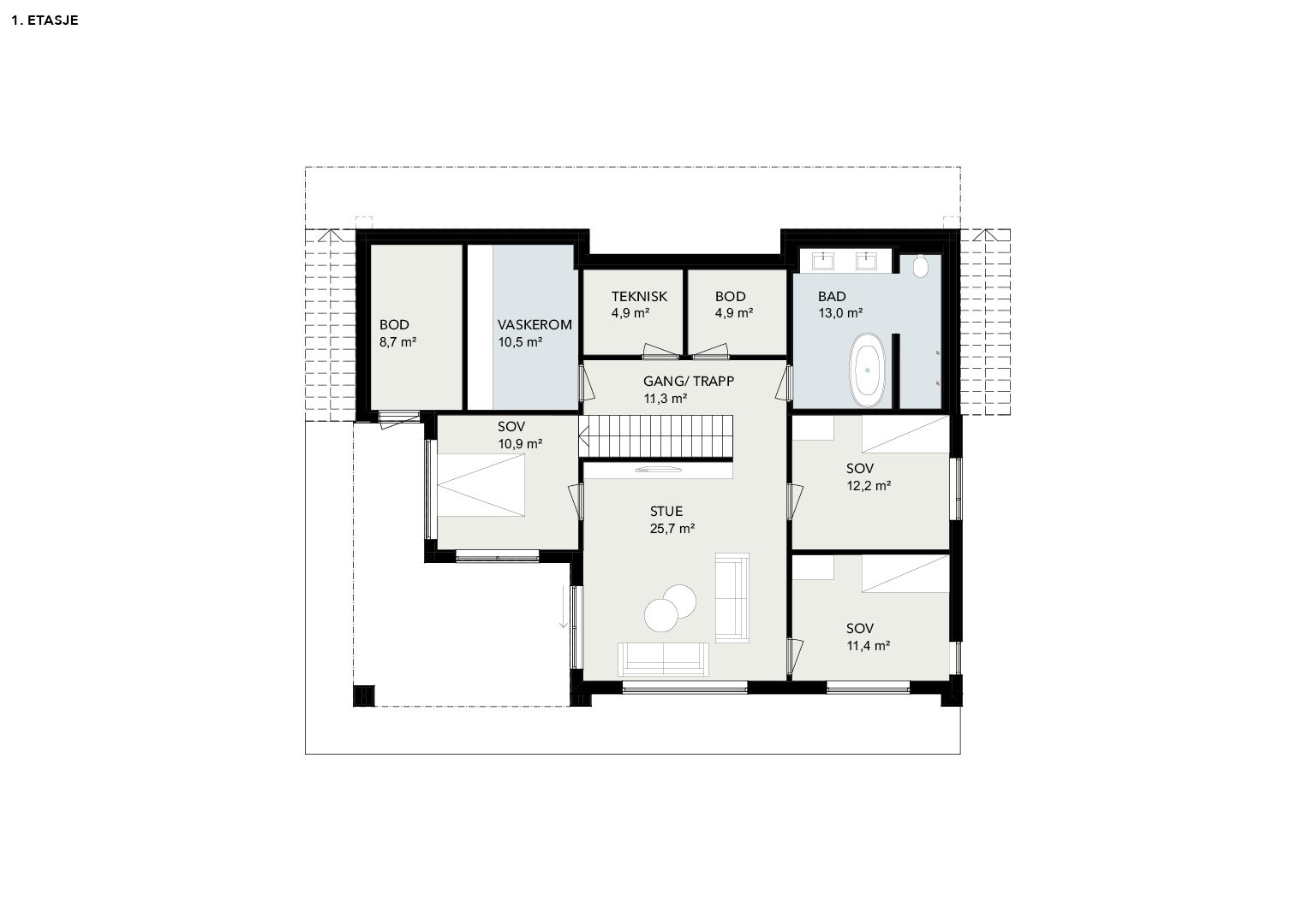 Et moderne hus med livsløpsstandard på hovedplan. Her skal du ikke mangle plass og hovedsoverommet er utstyrt med egen privat garderobe og bad. Hovedplanet har ekstra etasjehøyde og stor overdekt altan.