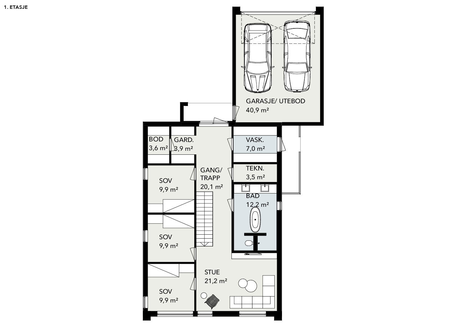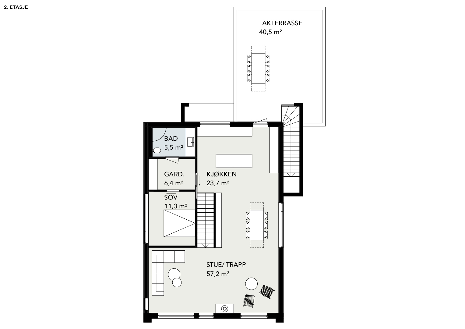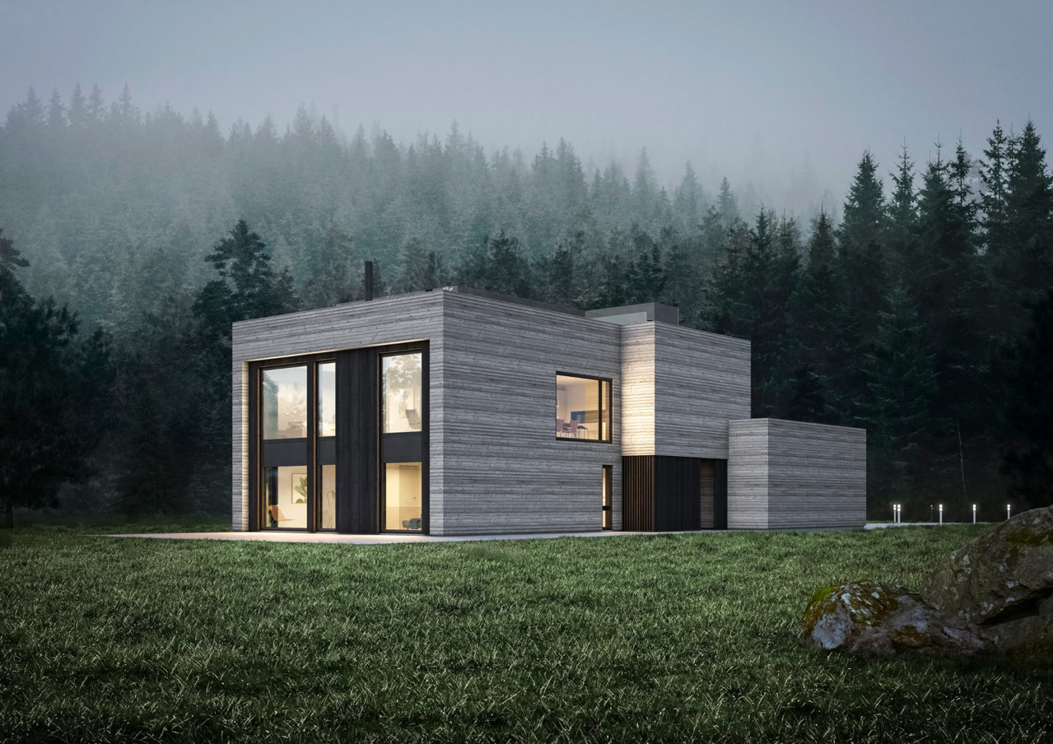 Et moderne hus med treverk som mykner designet. Det lyse huset har en åpen stue– og kjøkkenløsning med definerte soner og ekstra etasjehøyde på hovedplan. Soverommet har en privat sone med garderobe og bad. I tillegg får du både takterrasse og terrasse over en dobbel garasje.