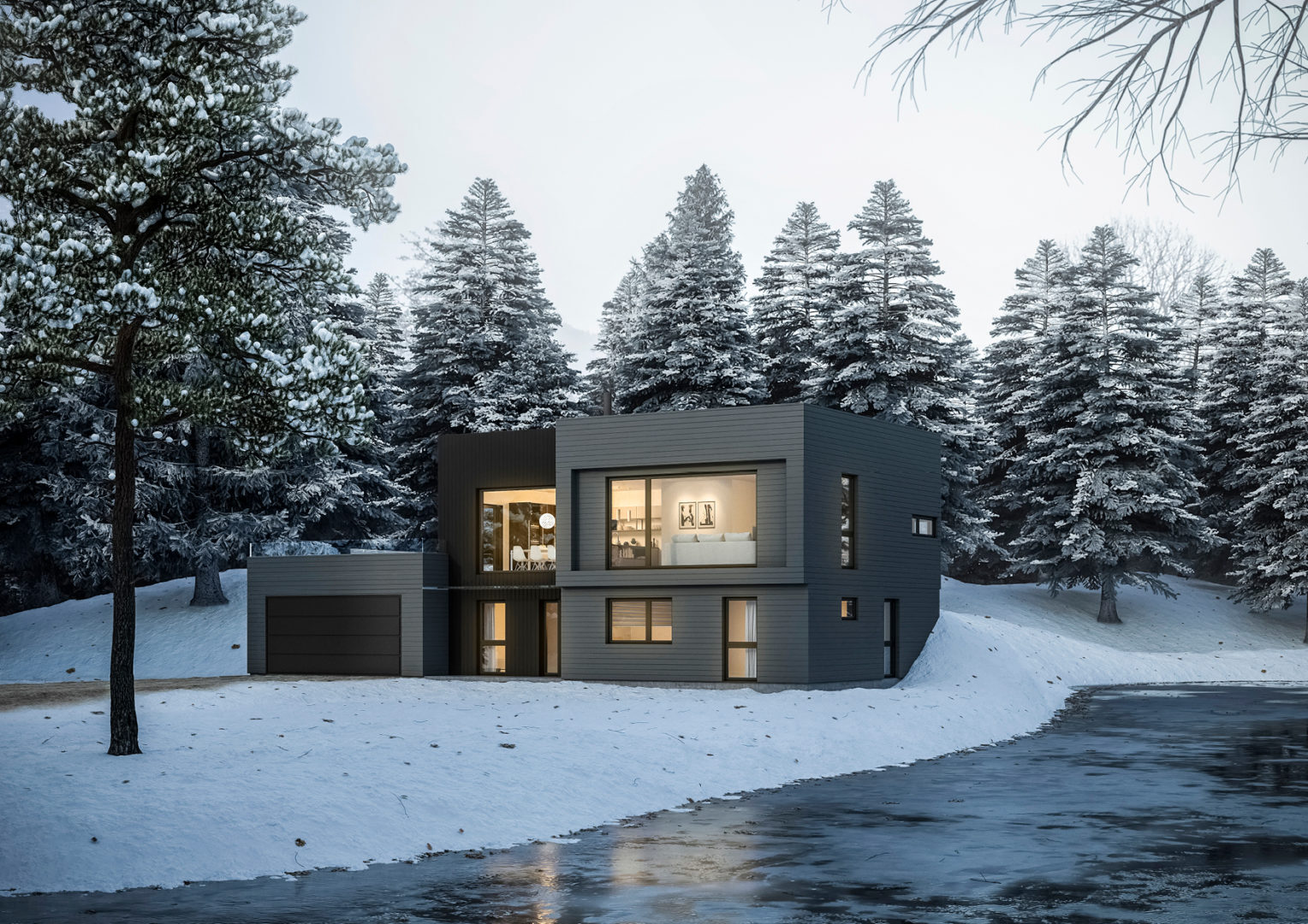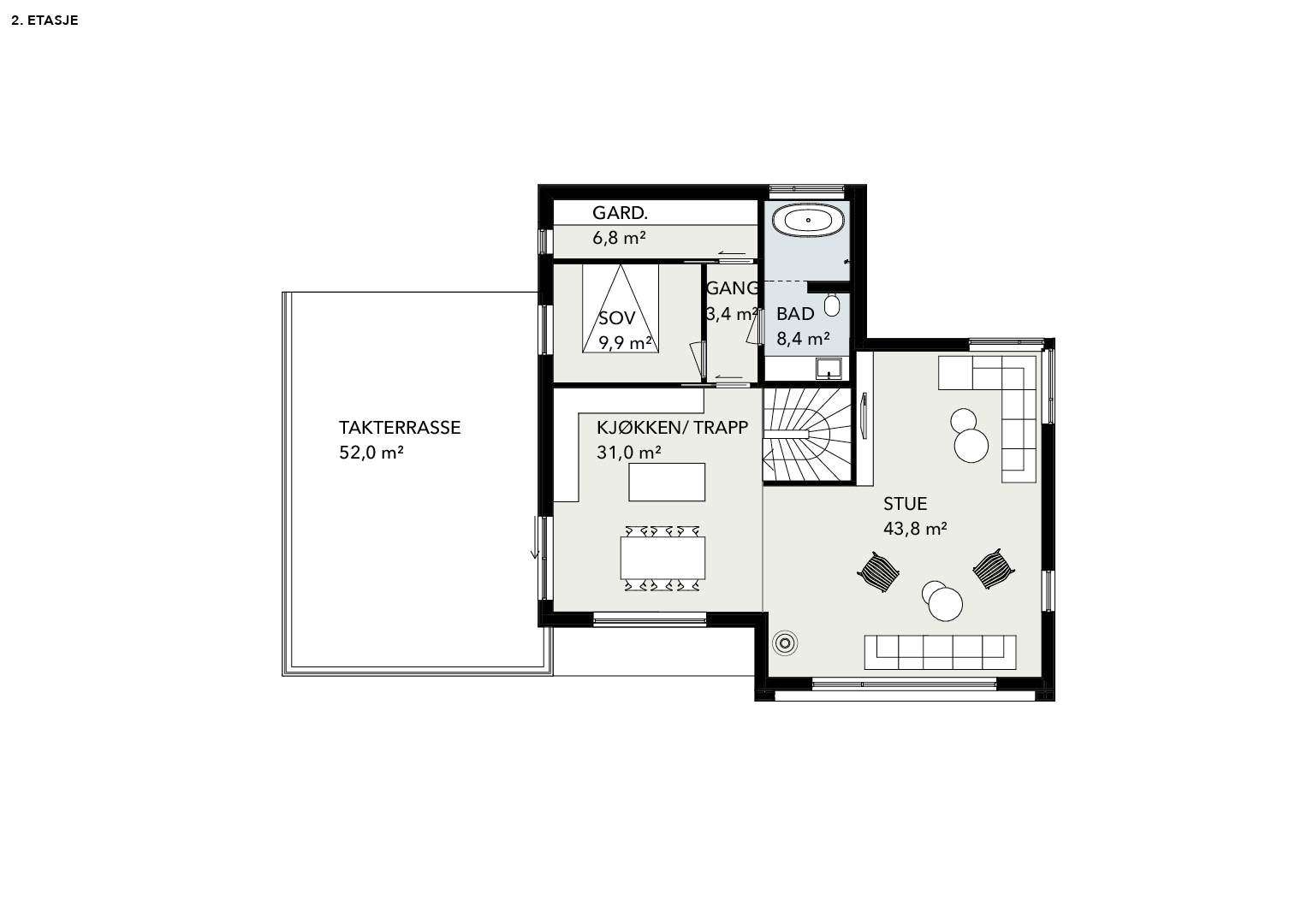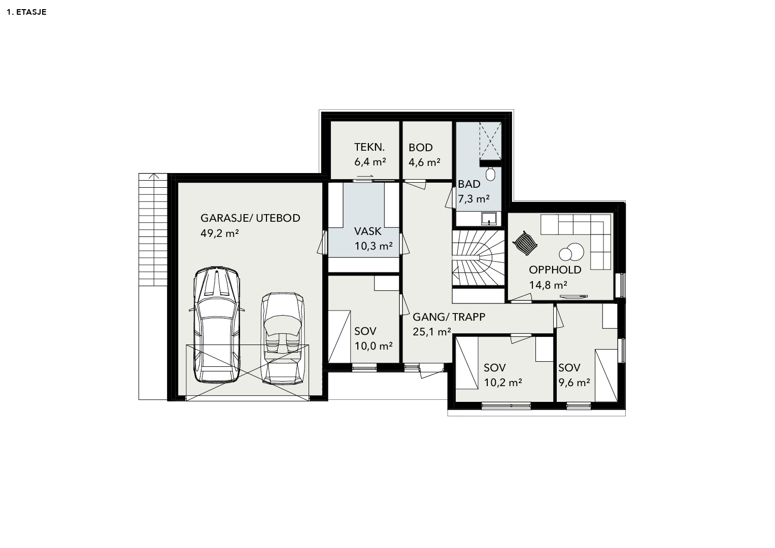 Her kan du nyte utsikten fra de store vindusflatene eller fra terrassen over dobbelgarasjen. Hele hovedplanet har ekstra etasjehøyde og hovedsoverommet har en egen privat sone med garderobe og bad. Huset har en åpen stue– og kjøkkenløsning med definerte soner.