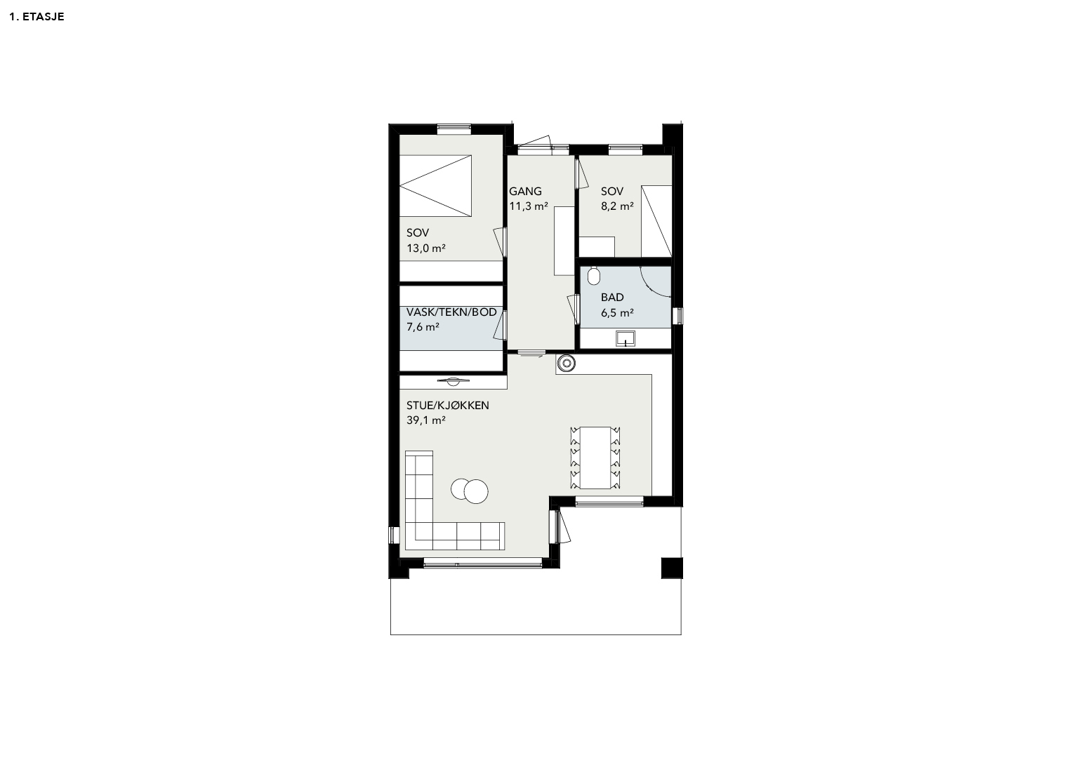 Et kompakt hus med tilgang til alt på én flate og livsløpsstandard. Store vinduer sørger for mye naturlig lys. Huset egner seg også fint som hytte og flermannshus.